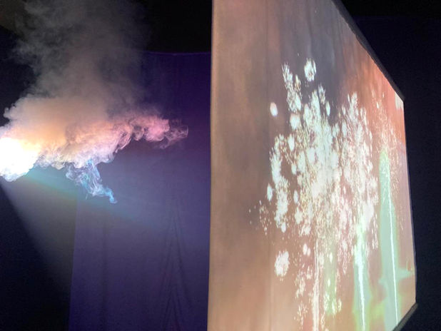 Wayne Lim, The Hyperrestrained Order (2020), 2-part audio-visual installation, smoke machine, neon light